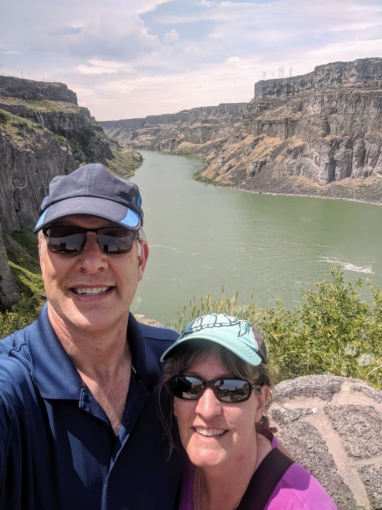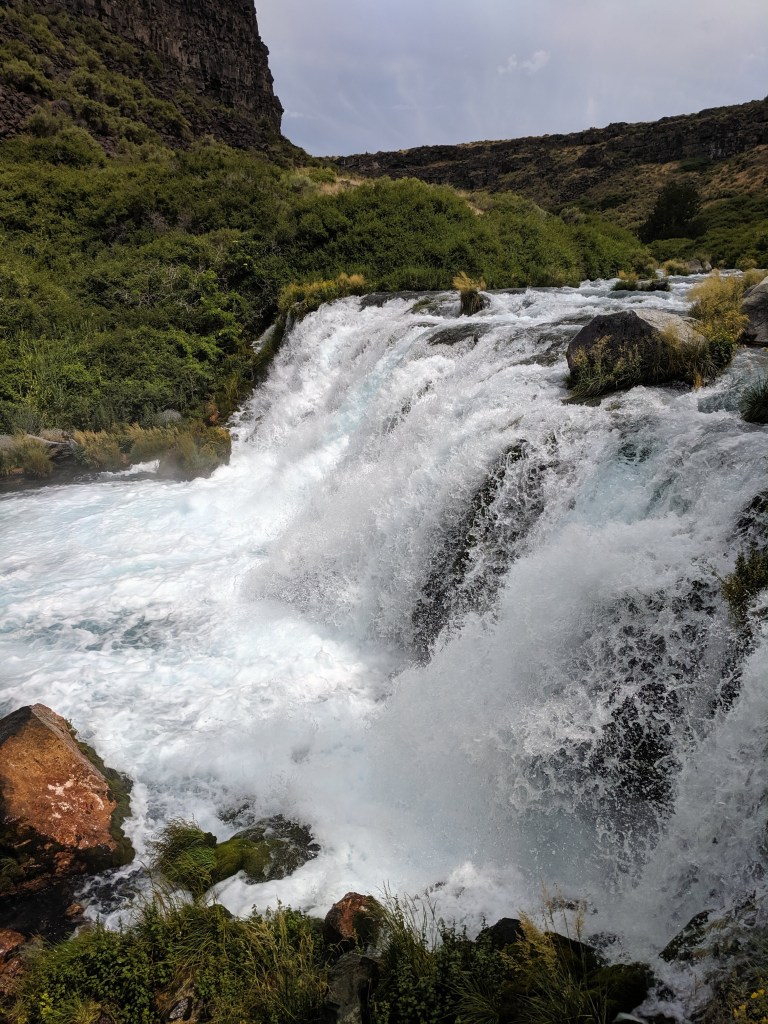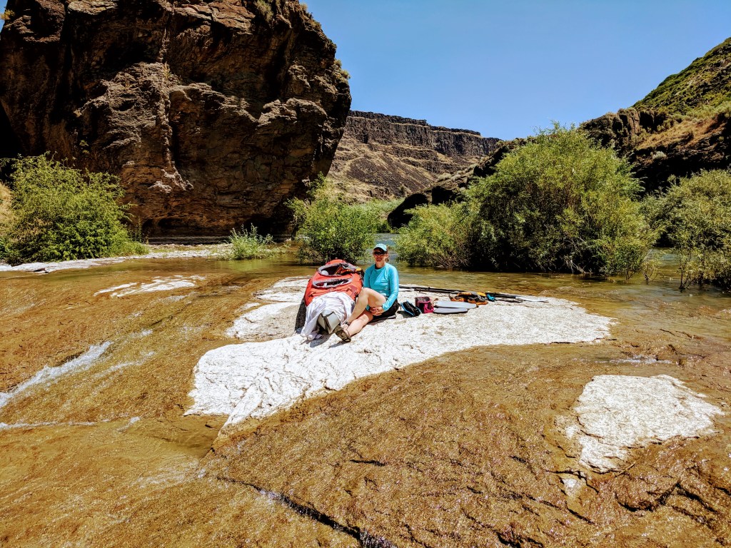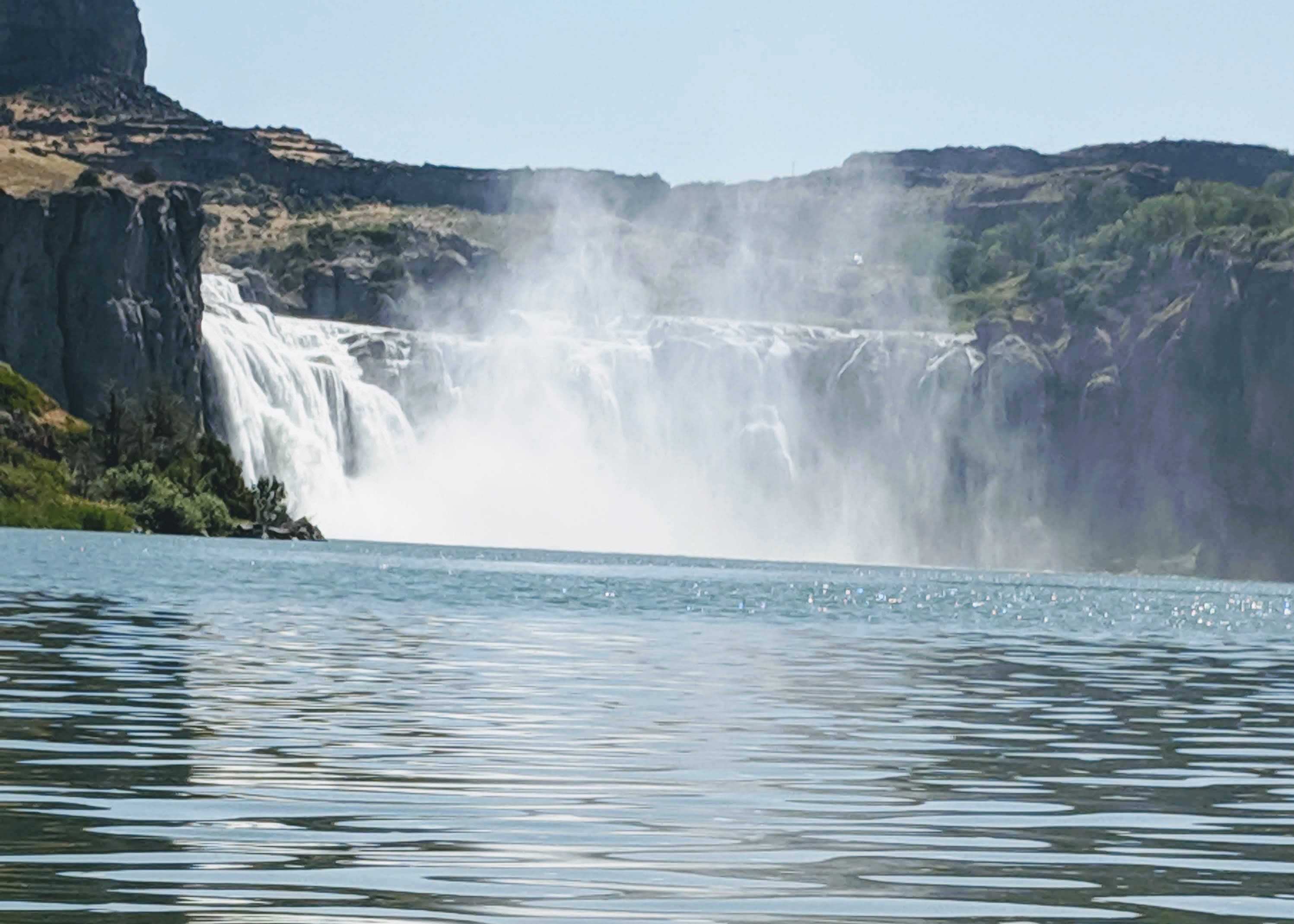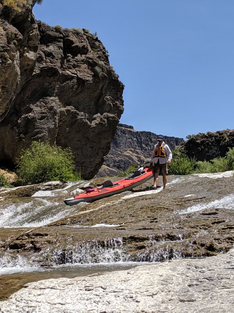 In the middle of this 4 hour journey is a portage over Pillar Falls. Most years it’s a simple trek over a rocky area of the falls to get above Pillar falls and hop back into the kayak continuing to Shoshone. Usually by this time of year, irrigation needs divert water from the river resulting in lower water levels. 2019 being a very wet year meant a delay in diverting water and the river was higher than usual. Even with all the water and in some places nearly knee deep in water we got up to the top and back far enough to push off and head to Shoshone falls. Coming back seemed to be going well until we navigated into a tree instead of around it. Water flow was fast enough to pin us there until Steve could wrestle the kayak back in position. Steve had already planned on jumping out of the kayak and into the shallow water to get us to the portage section. Him jumping out kept us from tipping completely over. Took in some water however. Once back on the rock area we took some time to dry out, empty out the kayak and have lunch in the middle of the portage area.