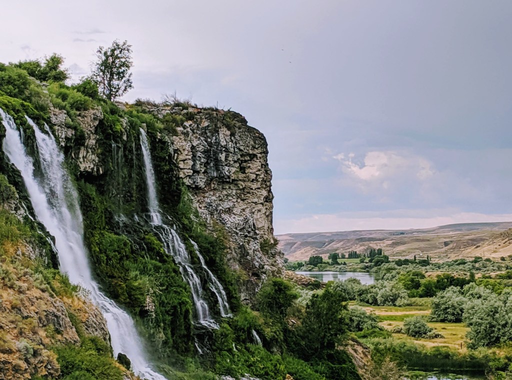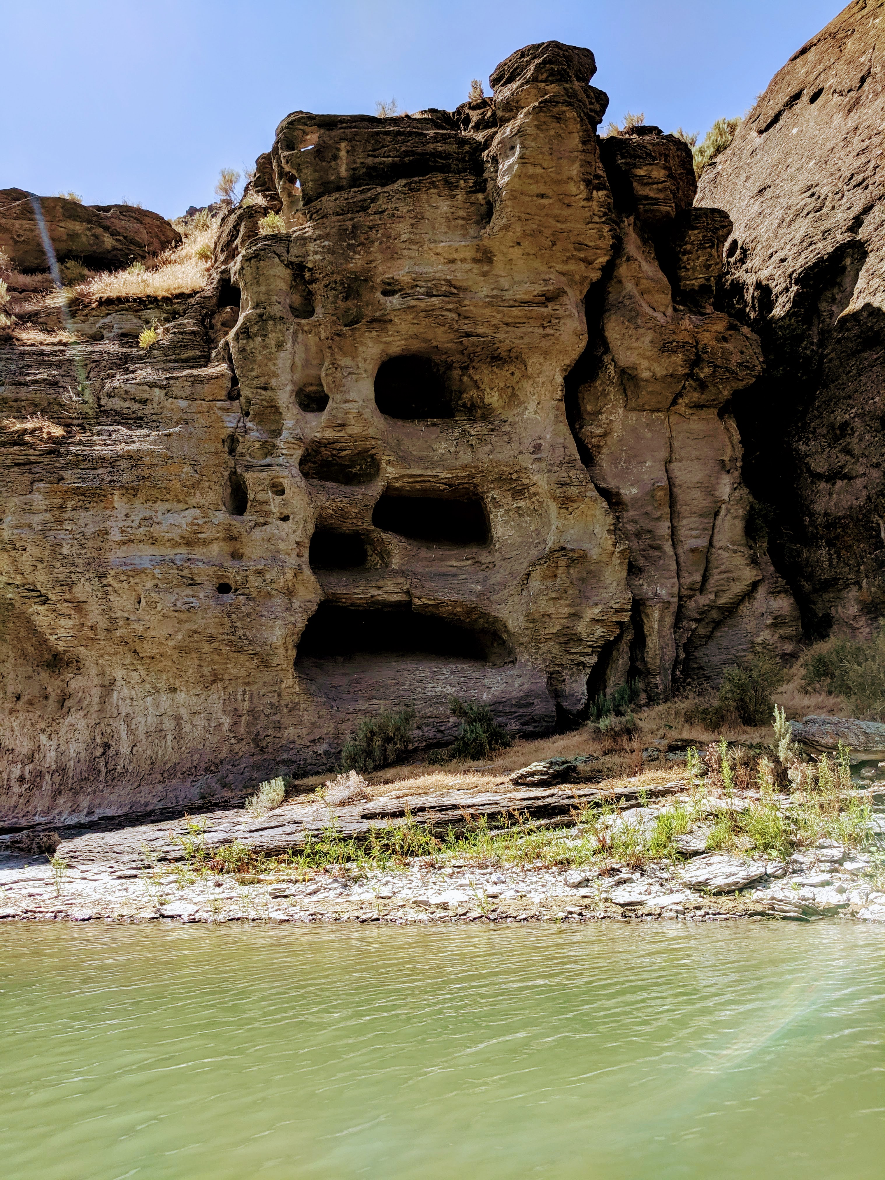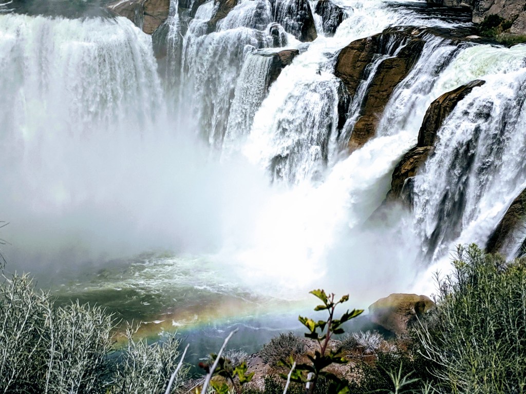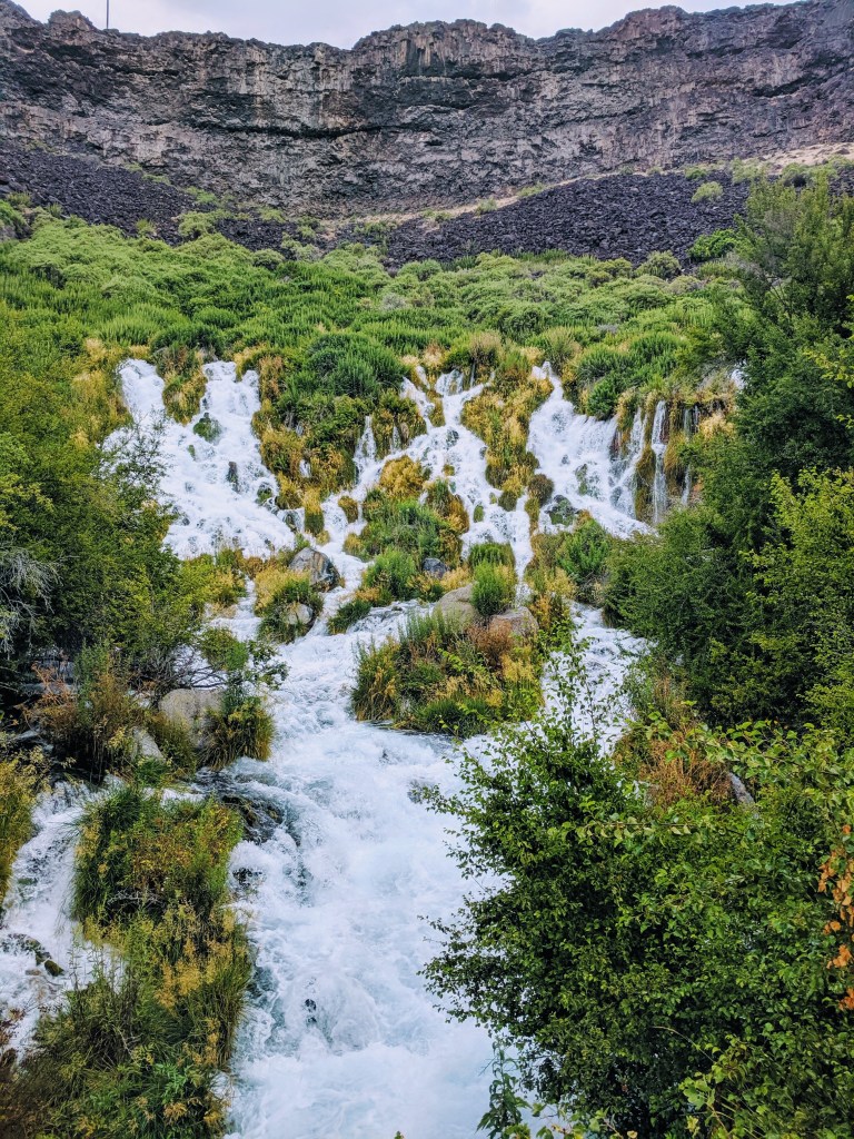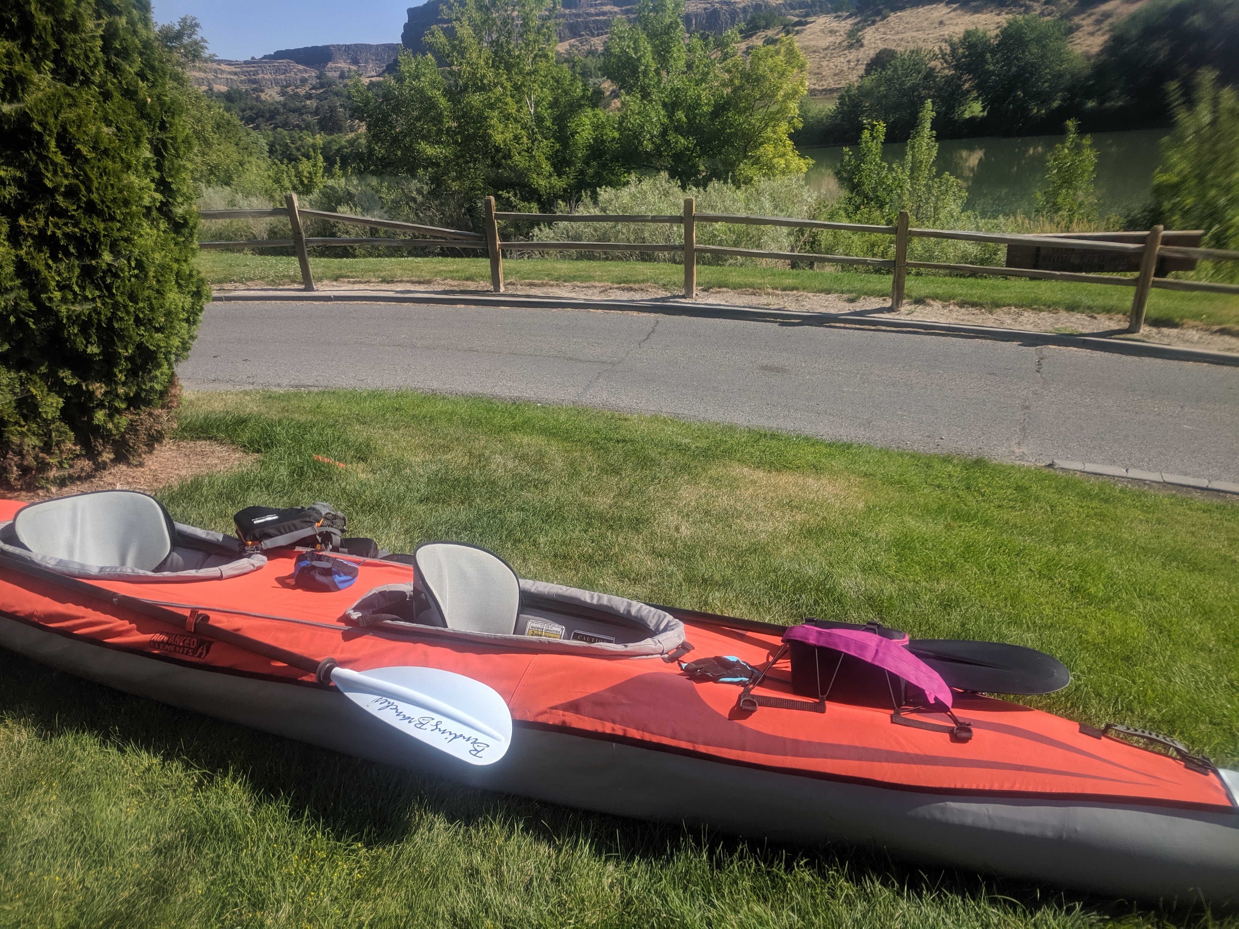 In the middle of this 4 hour journey is a portage over Pillar Falls. Most years it’s a simple trek over a rocky area of the falls to get above Pillar falls and hop back into the kayak continuing to Shoshone. Usually by this time of year, irrigation needs divert water from the river resulting in lower water levels. 2019 being a very wet year meant a delay in diverting water and the river was higher than usual. Even with all the water and in some places nearly knee deep in water we got up to the top and back far enough to push off and head to Shoshone falls. Coming back seemed to be going well until we navigated into a tree instead of around it. Water flow was fast enough to pin us there until Steve could wrestle the kayak back in position. Steve had already planned on jumping out of the kayak and into the shallow water to get us to the portage section. Him jumping out kept us from tipping completely over. Took in some water however. Once back on the rock area we took some time to dry out, empty out the kayak and have lunch in the middle of the portage area.