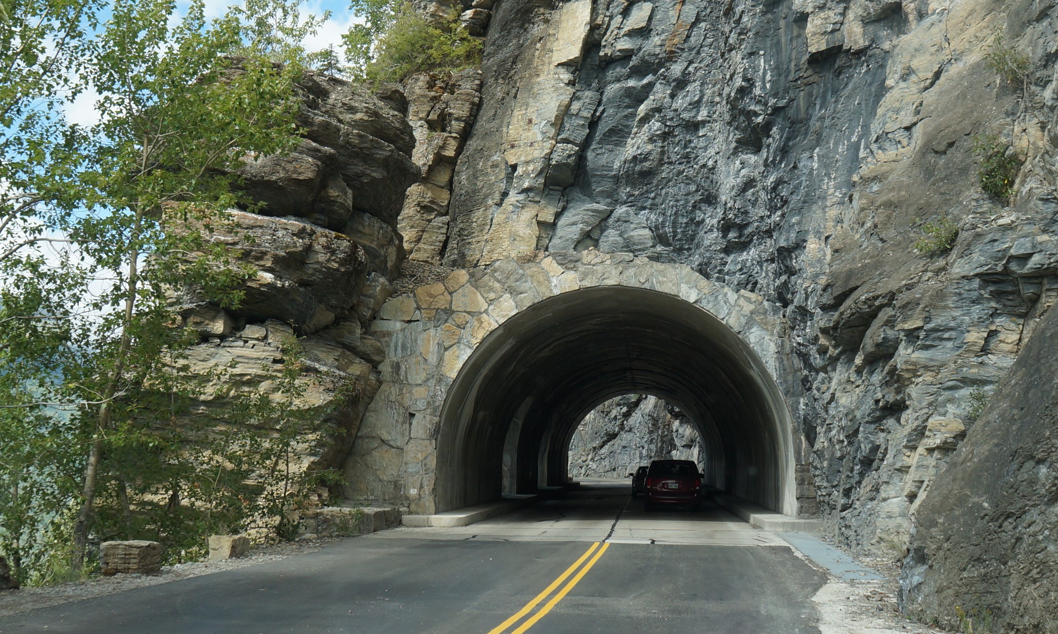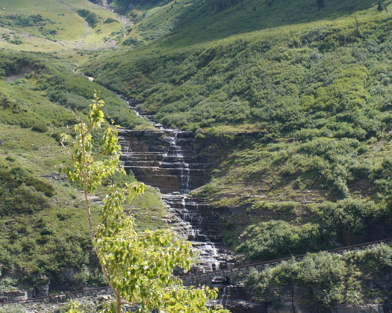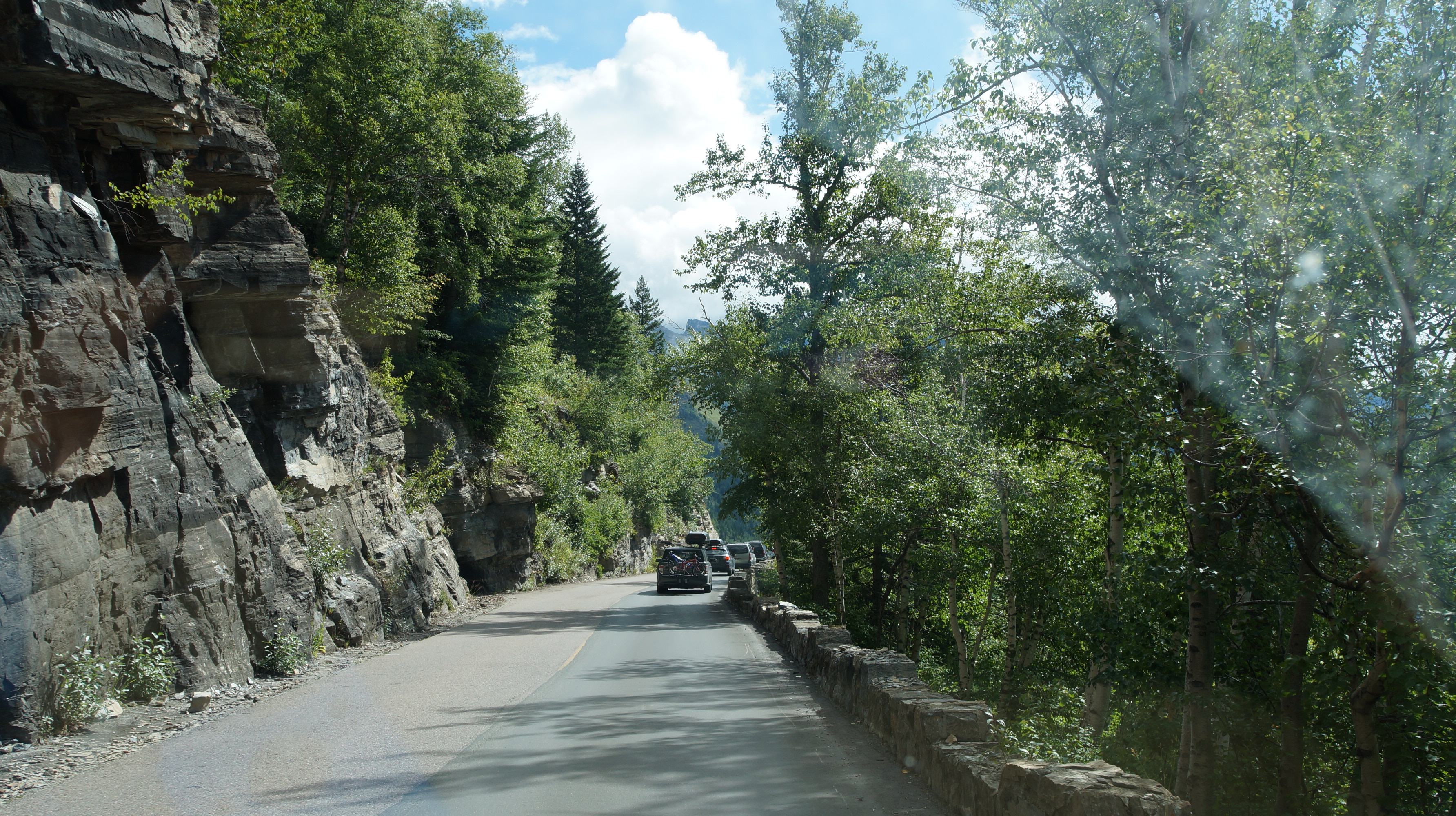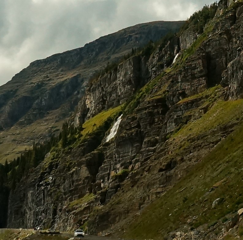 We made it to Logan pass and the visitor center was crowded with no parking; calls for securing a roadside lunch stop down the other end of the pass and through a tunnel.  Weeping wall waterfalls came into view around nearly every turn.