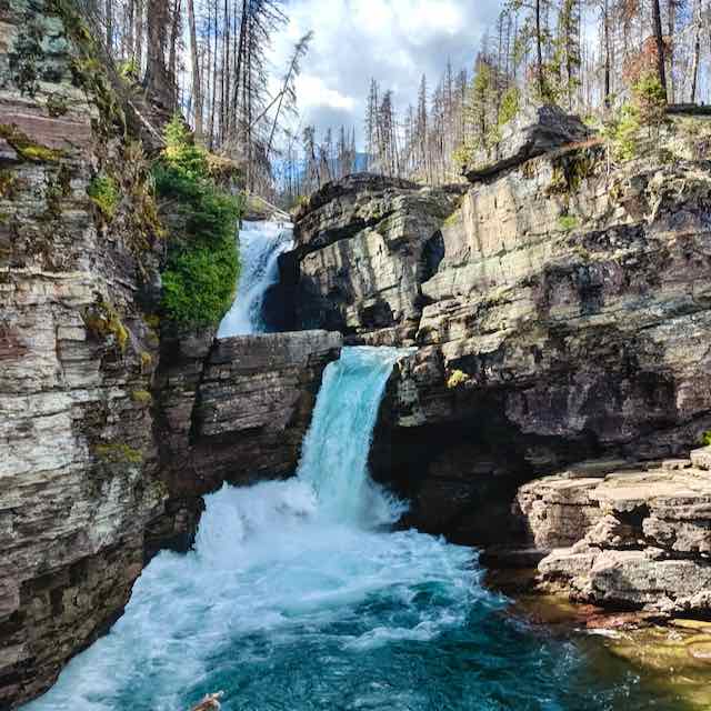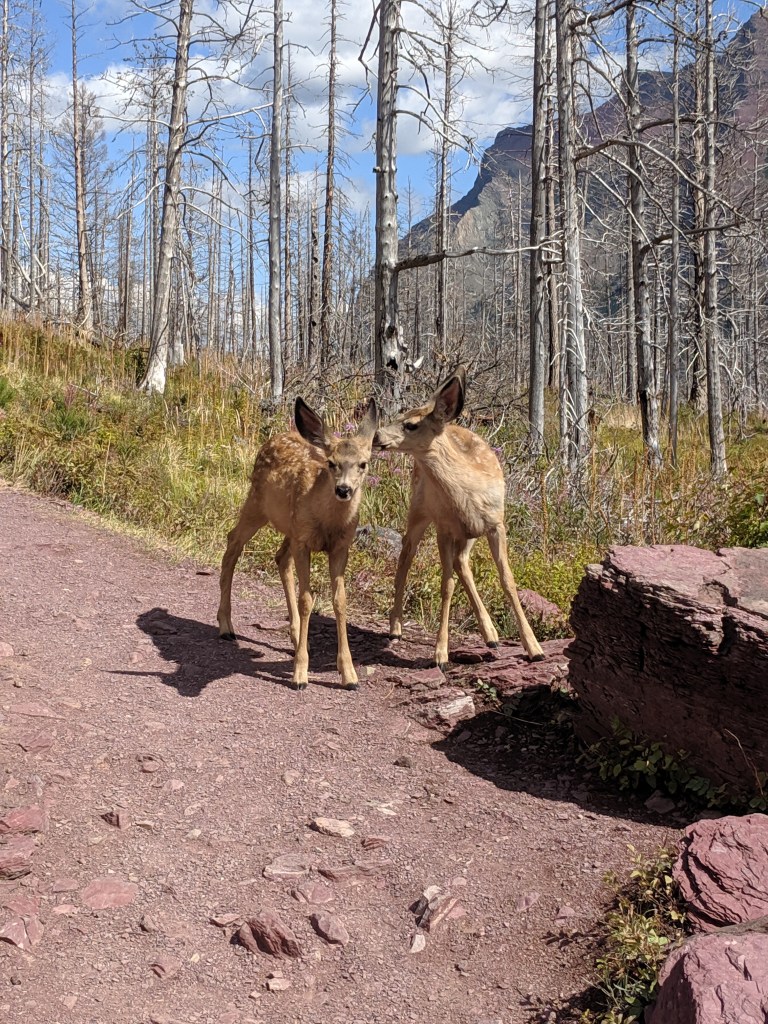 After lunch, we drove towards St Mary’s lake.  Of course the main trailhead parking was also full and we landed down another mile plus…gave us a 4.4 mile hike instead of a measly 1.5 hike to the falls.  There are three total along this route and we visited two of them.  The hike back gave me an unexpected treat.  A doe and two fawns were hanging out and walked right past us.  Close enough for us to reach out and touch.