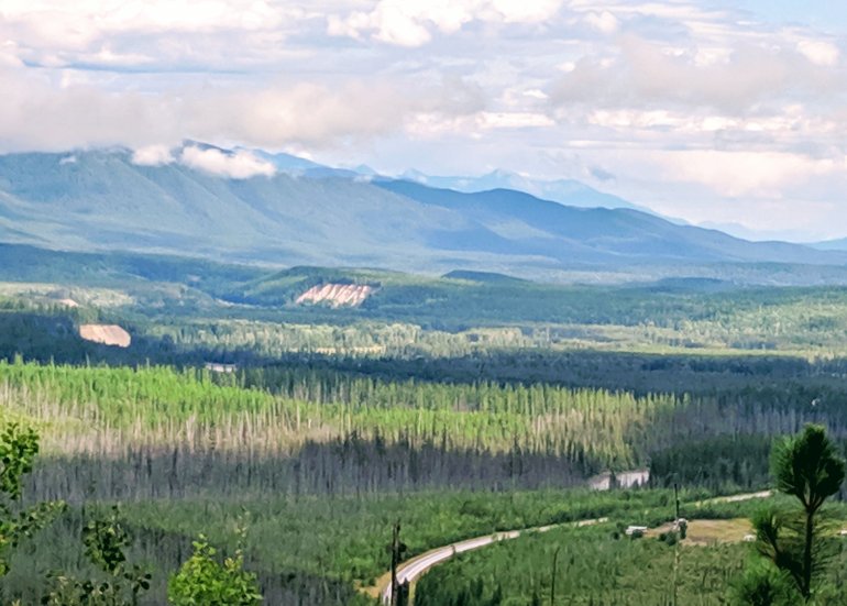 View of Outside North Fork River. the large bare hillside near the center was along our riverside camping area!