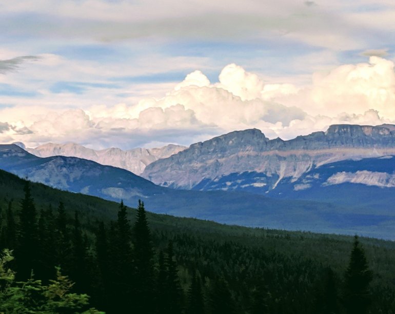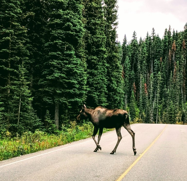 One more surprise on the lucky outing. Our one and only large wildlife sighting of the whole week in Banff and Jasper. Lady Moose crosses the road. We saw her leap to the road and were able to slow down enough for her to continue meandering to the other side. The 2nd moose played it safe and stayed behind the trees. I caught a glimpse of her just watching, wondering what her crazy girlfriend was thinking.