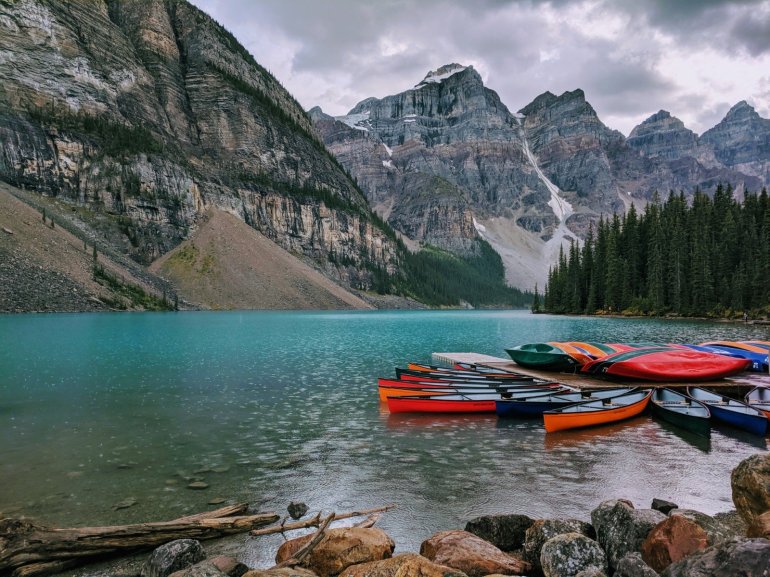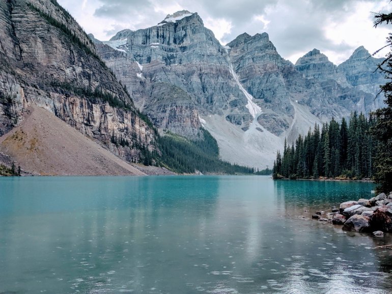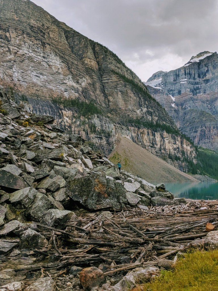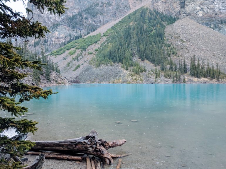 The scenery here may sound the same; it’s another glacier formed, beautiful turquoise, mountain framed, blue lake. Add in the moraines, the driftwood shoreline and even the rain, made this my favorite lake visit in Banff.