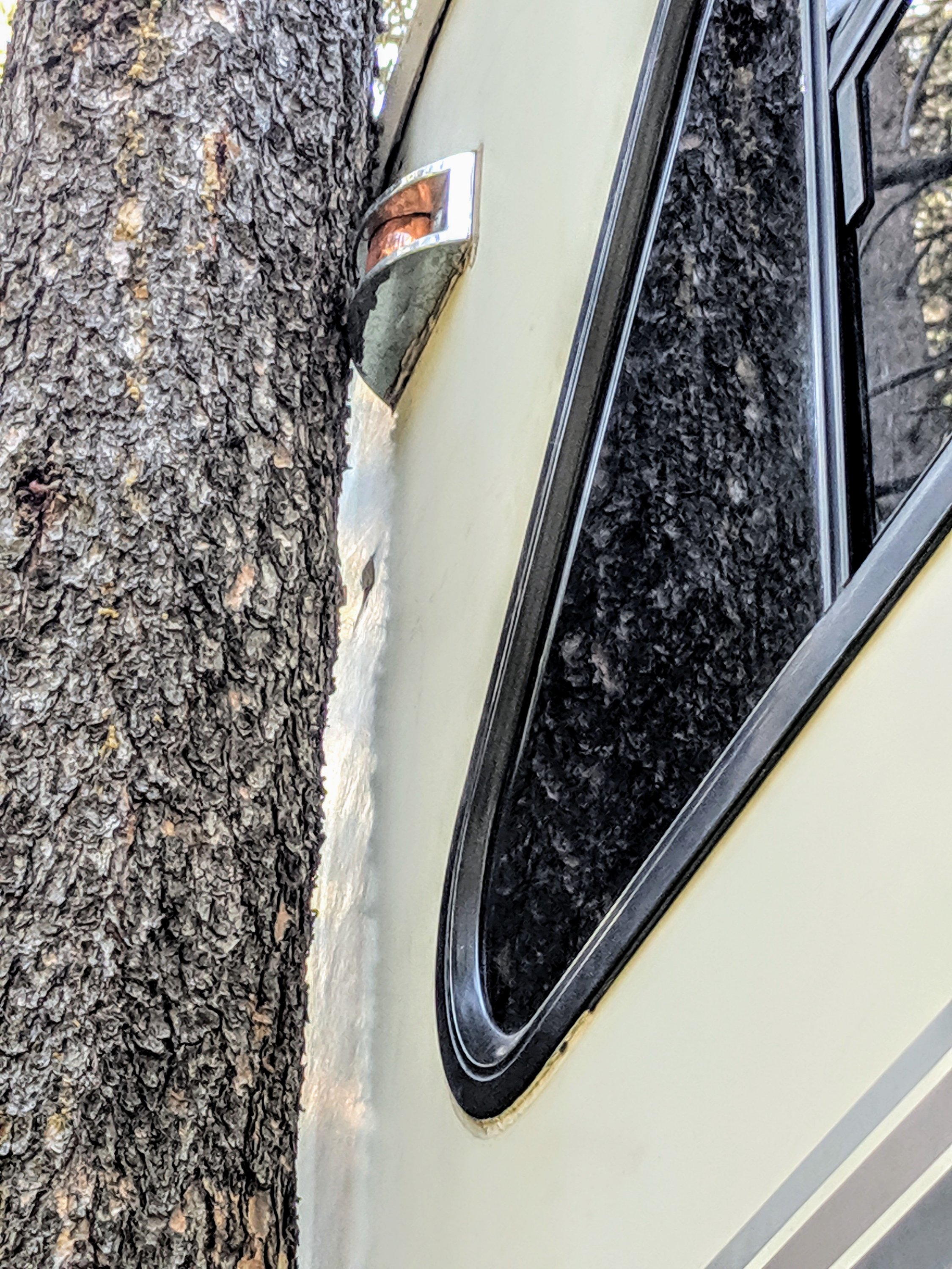 Watch out for those trees…snugged up close and when leveling the rig it leaned into a treebranch and poked a hole!!