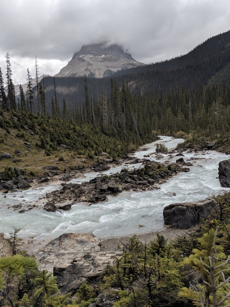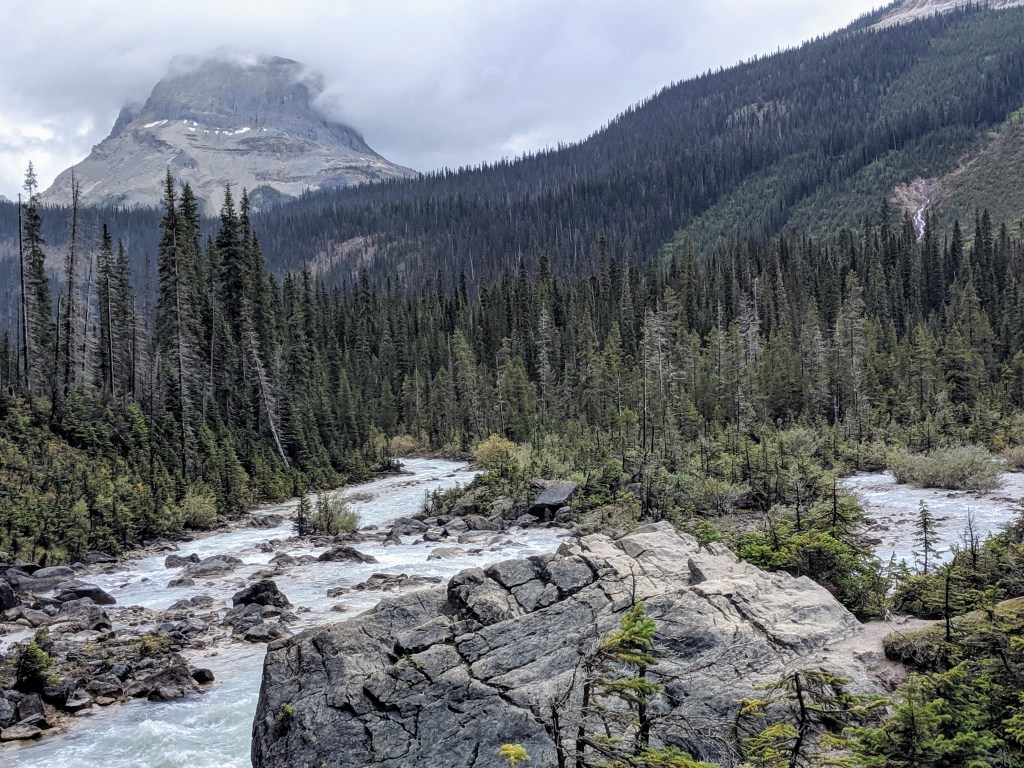 I wasn’t quite ready to leave Jasper but the weather wasn’t going to improve enough for spending much more time there. We headed back towards Lake Louise and HWY 1 making our way west. Yoho National Park is on Banff’s western border and is filled with trails, falls, railroad engineering displays. Both the Yoho and Kicking Horse rivers provide summer activities. Our first stop gave us an interesting read about the spiral tunnels and the late 1800s Canadian Pacific Railroad development.