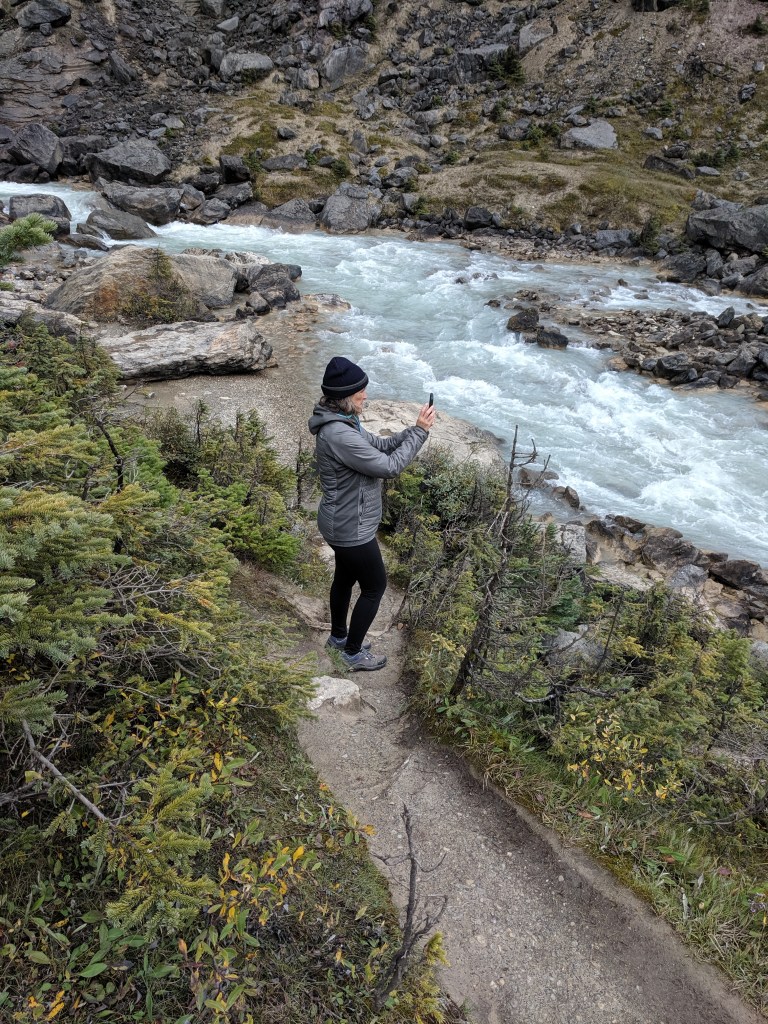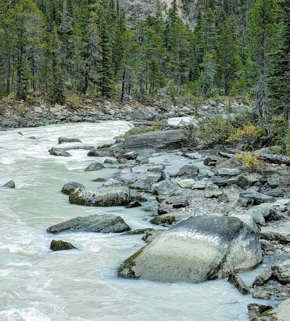The magnificent falls in September were huge; there were rocky platforms the water exploded off of before continuing its vertical descent. I can’t imagine what they’d sound and look like early in the summer. Yoho National Park has an intriguing set of backpack trails covering these falls and others. Something to consider for our return trip.
