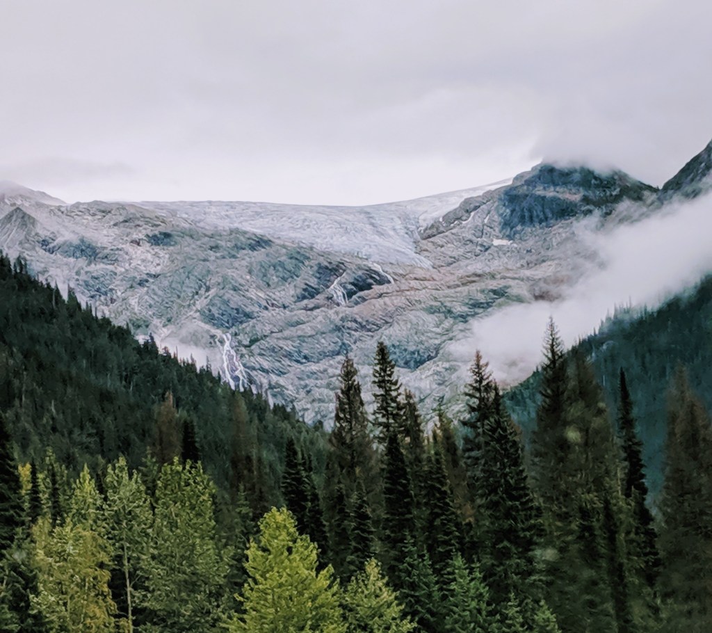 After our Waitabit creek campsite stay (https://workingonexploring.wordpress.com/2019/09/11/boondocking-in-bc-canada/) we continued west through the next park off HWY 1. Due to both heavy clouds and major road construction we didn’t get to spend any time at a specific site or trail. From the road, the Illecillewaet Glacier made an appearance through the clouds.