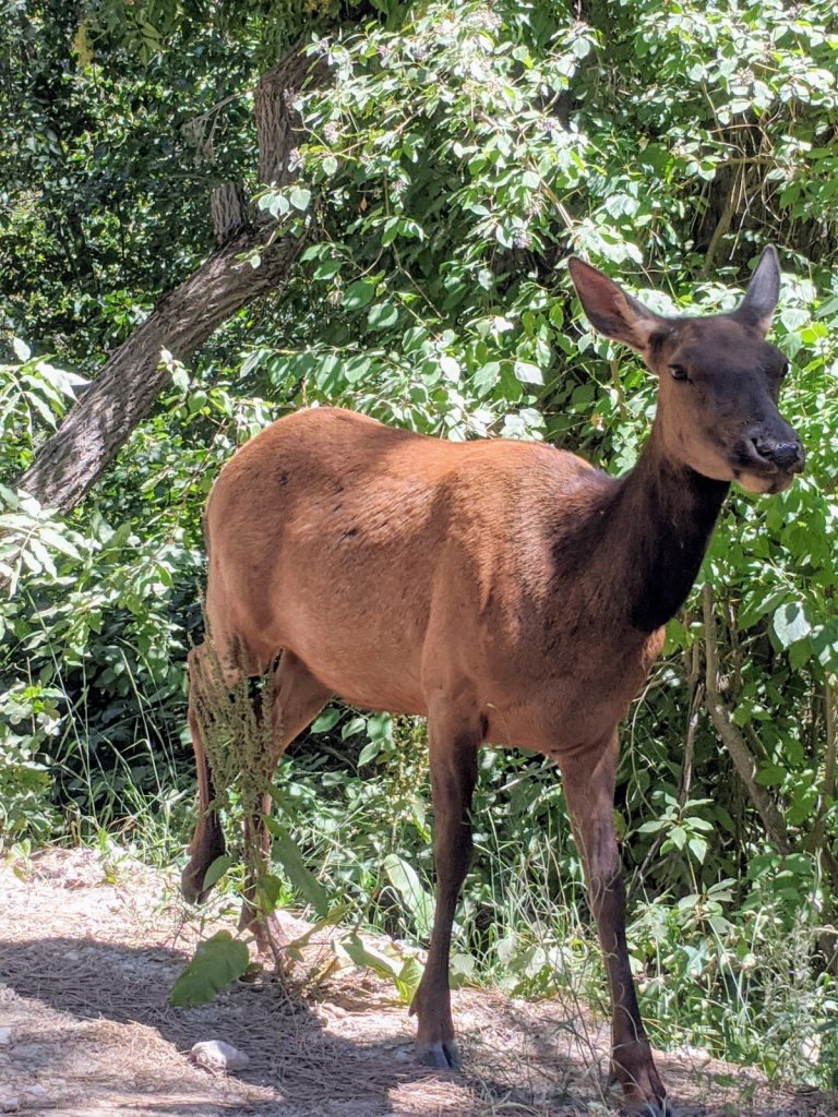 While driving around a neighborhood area called Wilderness Ranch, we caught a cow elk noshing next to the road. She patiently waited for me to fumble for my phone and snap her picture. That was a first!