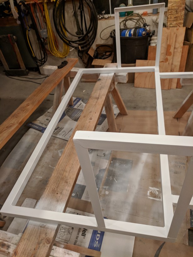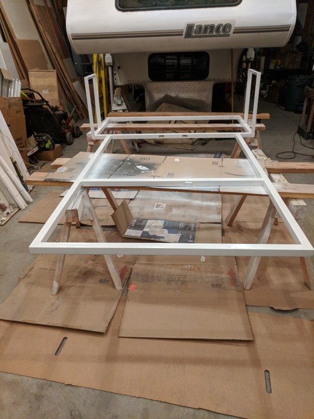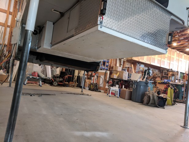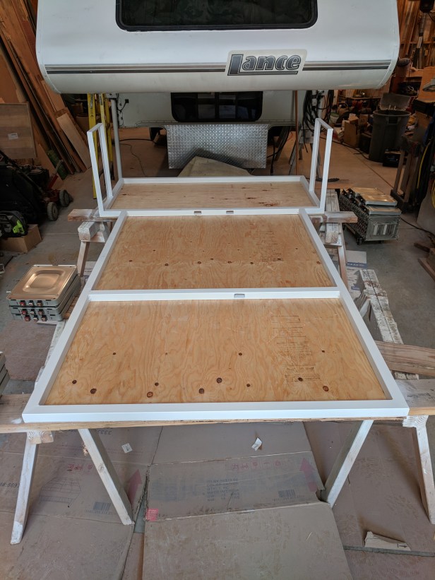 The battery case frame is 1.5″ x 1.5″ x 16ga steel tube. The footprint is the portion of the camper which rests on the truck bed (plus a little). It is 48in wide in the front and 58in wide in the back. There is some slight additional footprint in case at the front of the (wider) rear portion where the angle frames stand up to provide cable ways and an equipment compartment.