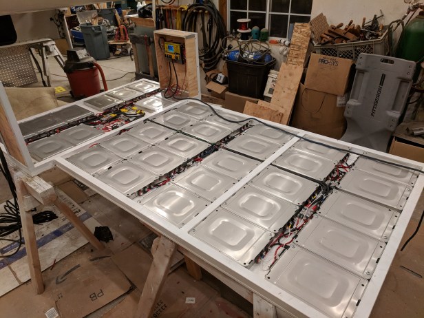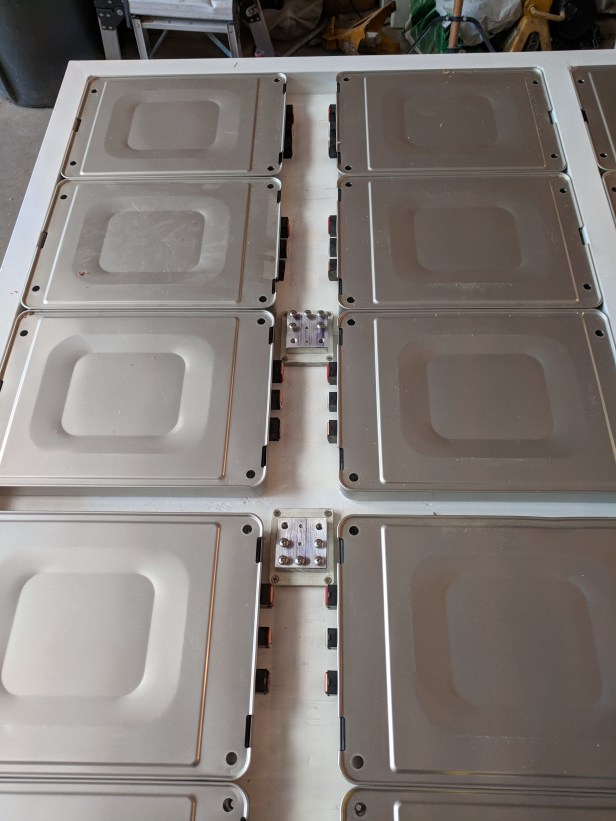 The camper battery is built from packs salvaged from a used 2015 Nissan Leaf electric car battery. The Leaf battery is comprised of 48 lithium manganese oxide packs, each containing 4 cells, internally connected 2 in series and 2 in parallel (2S2P).