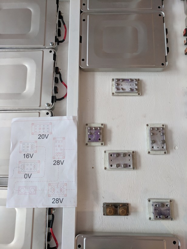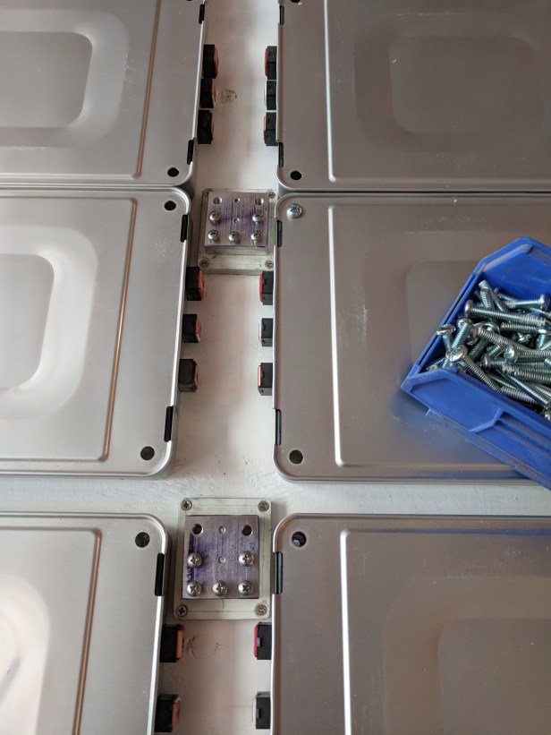 Each compartment contains buss bars to connect the parallel set using 1-8 gauge wire daisy chaining 2 packs, supporting up to 40 amps per pair or 20 amps per pack. The packs are rated at 90A max in the Leaf (45A/cell) but the camper design is much less demanding. The system can draw around 200A @ 26.25V nominal (or 20A/pack, 10A/cell). Buss bars of each of 3 sets of 10-2S2P packs and 1 set of 5-4P pack are connected using 2-2 gauge wires, supporting 220A through the battery.