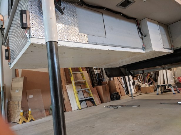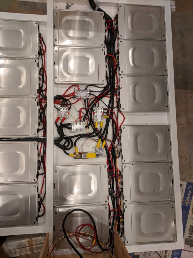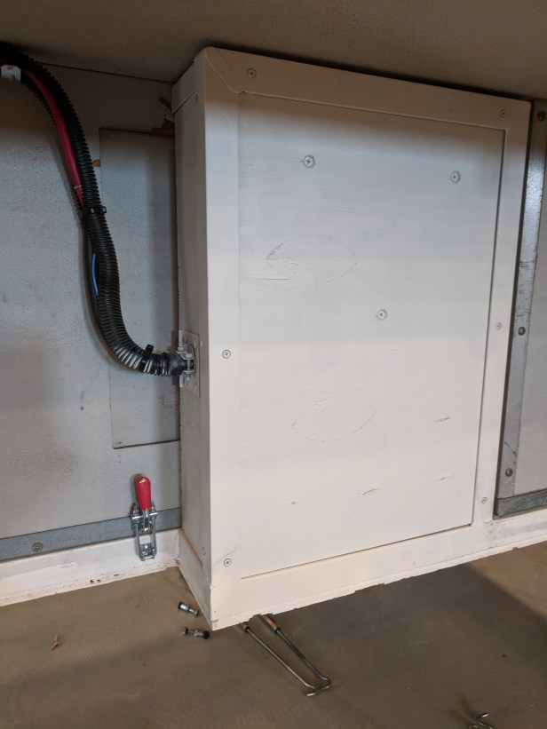 Because I want to be able to both fully detach the battery from the camper and be able to return the camper to its original condition, all cabling must be inside the battery case. Any connections to the camper must be readily disconnectable. To facilitate this, the wider, rear compartment extends forward of the camper footprint around 14in on the driver’s side and 10in on the passenger side. These extensions will become equipment boxes about 5″ deep with the driver’s side one being accessible from inside the camper and containing the BMS and other equipment.