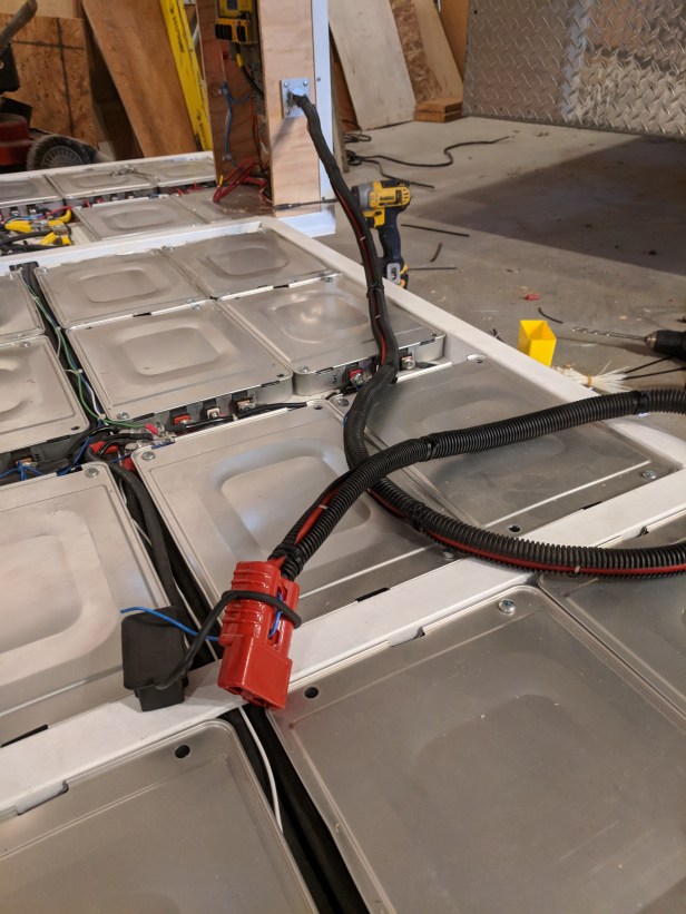 The battery layout is in 4 groupings of packs (effectively my ‘3-1/2 packs’ in series). In the front compartment is one group of 10-2S2P packs. In the center compartment are 2 groups, a second 10-2S2P packs and one of 5-4P packs (this is the ‘half’). In the rear compartment is the final group of 10-2S2P packs.