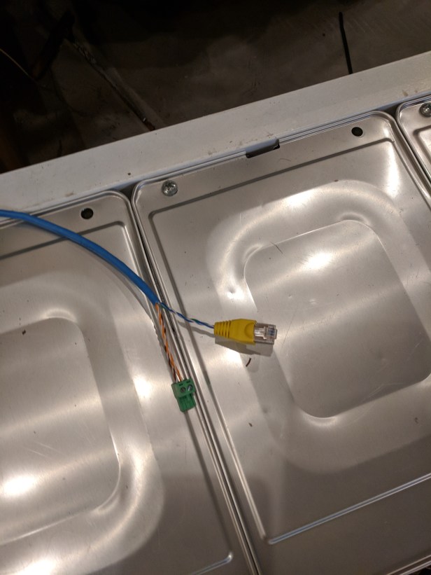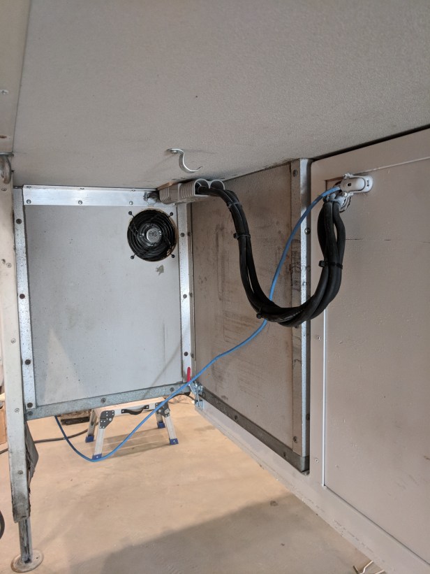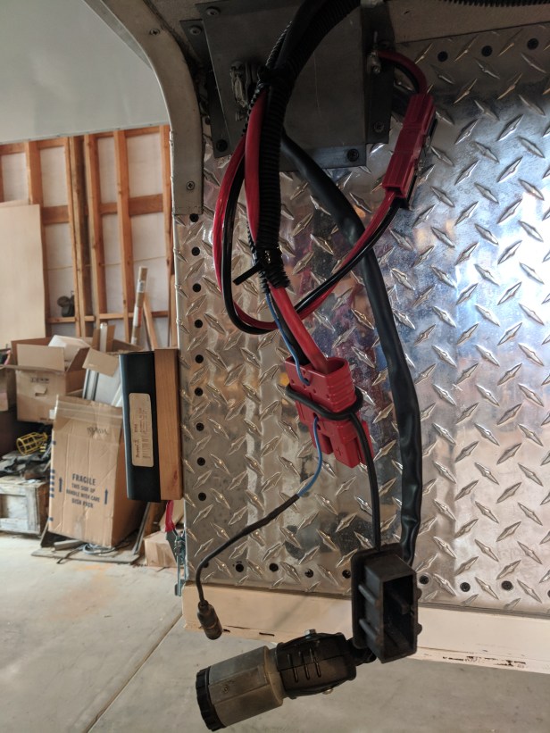 Leading forward from the driver’s side equipment compartment is an umbilical containing cable for 3 purposes; 2-4 gauge cables on a 175A (red) Anderson hermaphrodite connector provide the ability to link to a modified 29.6V@120A secondary vehicle alternator excited by the camper battery (14ga blue wire in the umbilical). Charging is controlled by an external voltage regulator in the engine compartment. To charge, from the alternator, there are multiple interlocks; 1) the BMS must allow charging, 2) a manual switch in the cab console must be ‘on’, 3) a thermostat on the alternator permits operation at less than 118C, 4) a relay closes only if the ignition is active. Also included in this umbilical are 2-8 gauge wires from the 40A DC-DC converter to provide 13.8VDC to the camper control panel for ’12V’ systems.