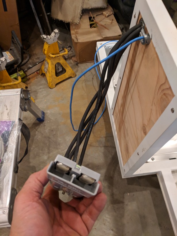All external battery connections and management connections are made in the rear battery compartment which has a path for cables from both sides. The passenger side ‘stand-up’ compartment has the main power connector with 4-2 gauge cables on a 350A (gray) Anderson hermaphrodite connector. The connector mates the battery to a switch then to the inverter/charger. Also on the passenger side is a blue CAT5 cable connecting the BMS (on the driver side) to the inverter (on the passenger side) to communicate ‘OK to Invert’ and ‘OK to charge’.