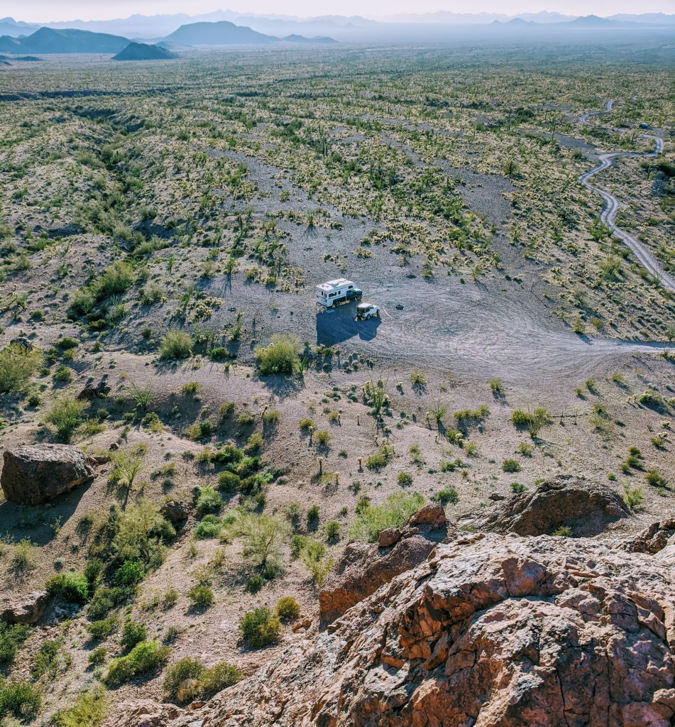 A key attraction of a truck camper is to being able to travel and camp in areas where trailers, Class C and Class A RVs can’t travel. Although we’re not anti-social, we do appreciate being able to get away from everyone and park out in the boonies. Here’s a perfect example. We’re at Kofa Queen Wilderness Refuge out on the jeep trail. Most campers stay off the main road which is 5 miles through the jeep trail away. One of our favorite desert camp areas to get away from it all.