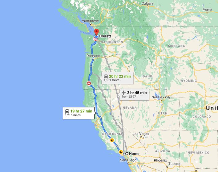 The I-5 route on the left was 1215 miles and 19:27 hr:mm versus the plotted route ending up being more than 1345 miles and over 22:50 hr:mm driving time.