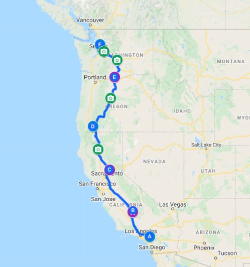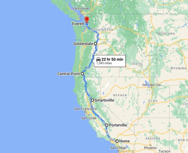 With little time to actually explore and enjoy a few areas on our way up from Southern California to Everett, Washington, I needed to figure out how best to divide the route. Normally, we prefer to drive around 200 miles per day and even stay 2 nights in one spot as we travel. Well, none of that was going to happen! It’s time to get creative so we can at least have an interesting, fresh and scenic drive.
