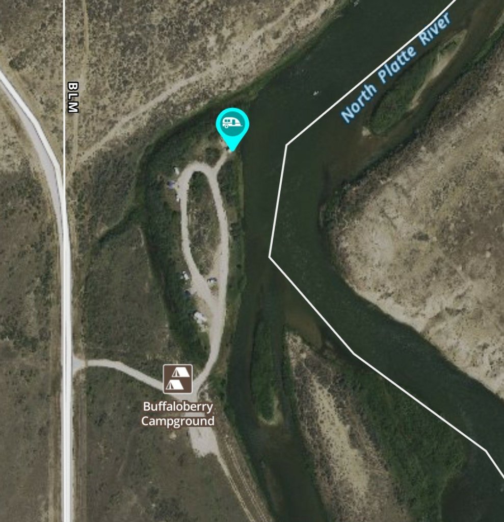 This is Trapper’s Route Recreation area on the North Platte River and it sits between Alcova Dam and Casper, WY, south of WY-220. This area of the river is popular for floating and fishing out of the Casper, WY area.