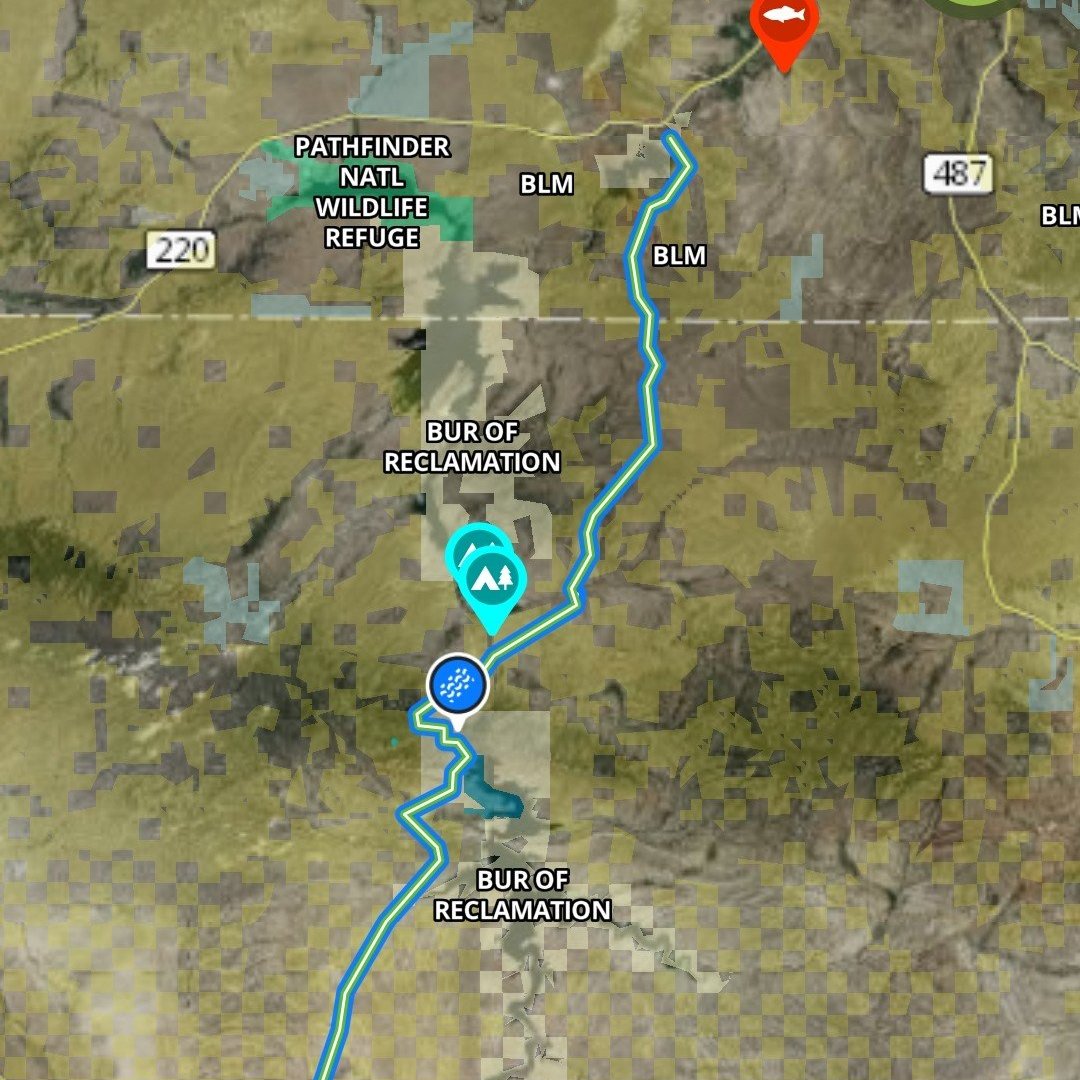 We traveled along the Seminoe Road to Alcova Dam which is shown on the first map below in the blue highlighted road. Then we continued on WY-220 to a left turn taking us into BLM area and several fishing accesses and campgrounds.