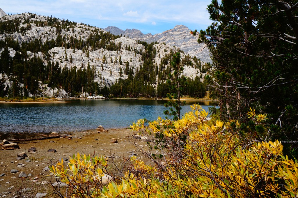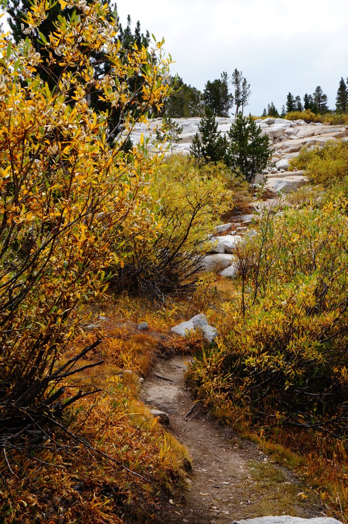 From a backpacking trip in the Eastern Sierras in late summer, the colors contrast with the white boulders and dark blue lakes.