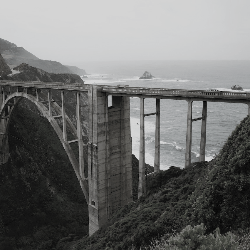 The bridge depicted below is the Bixby bridge along CA HWY 1. It was completed in 1932 and spans a deep canyon on the Big Sur coast. One of the most photographed bridges in the state.