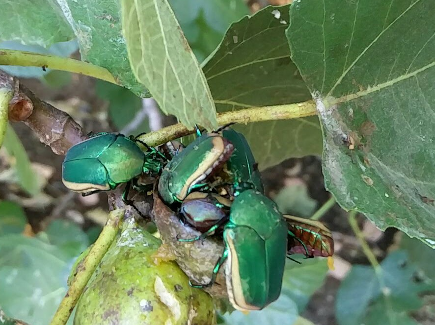 If we’re not diligent about picking the figs before the skin starts splitting, these beatles will feast on figs. We haven’t seen them in a couple of years although that’s most likely due to use usually being on the road after the first crop matures. I believe these are the Japanese Green Beatles. Very iridescent, large, yet harmless to us.