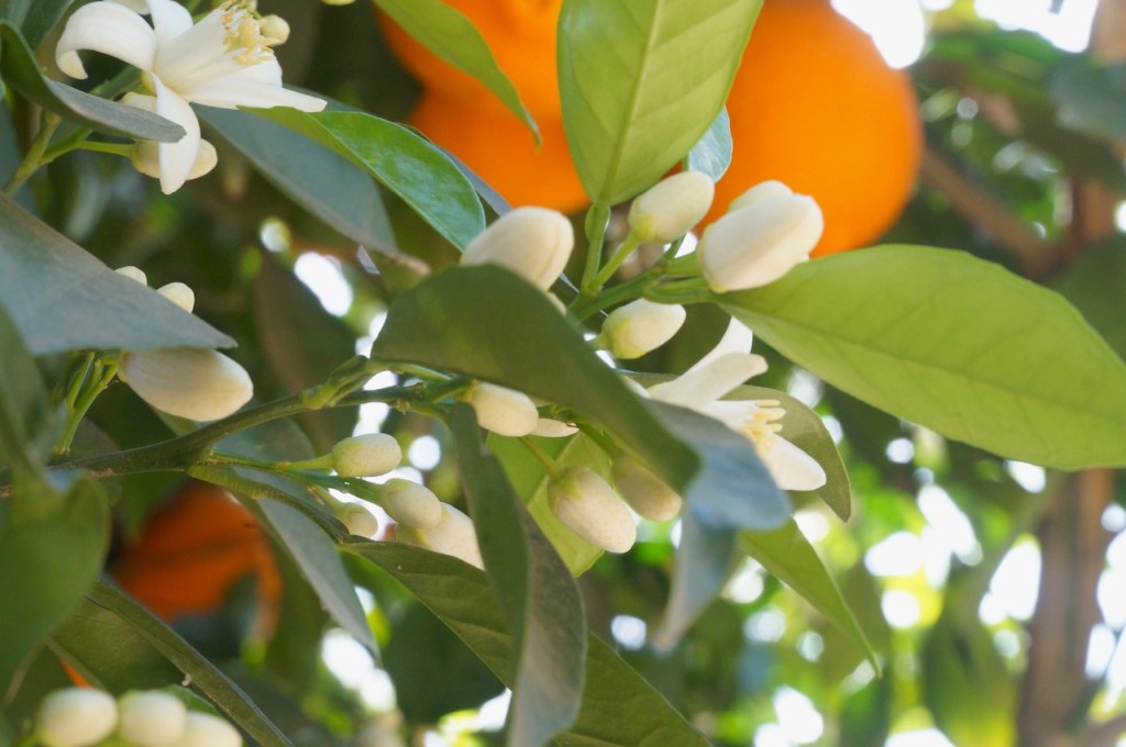 The blooming cycle for citrus happens 2-3 times a year and we usually have at least 2 seasons of fruit still on the trees when the new cycle starts. There’s nothing quite as lovely as orange blossom scent when the trees are all flowering. If you’ve been to Disneyland’s California Adventure in Anaheim, CA, there’s a ride where your senses are overwhelmed with the area’s historic smell, blossoming orange trees. It’s quite the experience.