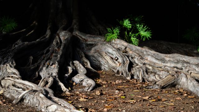 Why do these tree roots sprawl so far above ground? Our trees around here and in our forests, simply sprout a trunk and grow upward from there. Yet this tree sent out it gray roots above ground like fingers stretching outward to catch the suns rays.