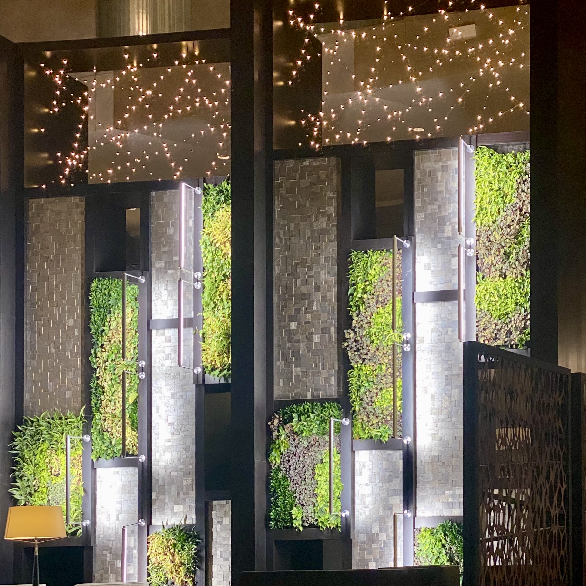 There’s a lot going on here with the lights, shadows, live plants, metallic blocks all under those twinkle lights and then it’s surrounded by cut metal wall panels. I was trying to figure out how to build one in the new home we’re building. Then we saw the plant guy working on it the next morning. I decided it would be too much work and responsibility! He needed a scissor lift to maintain all those plants. So, I’ll just enjoy this one at the Detroit Westin when I visit.Â