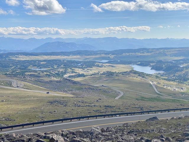 Following the vista are a few pullouts for hiking trailheads and alpine lake views.