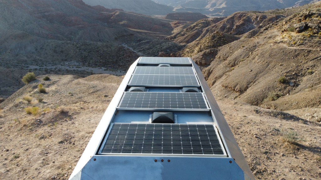 Harnessing the sun’s energy is one way power is generated. Energy that warms us, provides light, and allows us to cook and preserve food. Our adventure rig is outfitted with a full load of solar panels. Our solar provides us with A/C when it’s over 90F during the day, heats our water, refrigerates our food and even provides entertainment. As long as we can take in solar power, we can be off grid for quite some time.