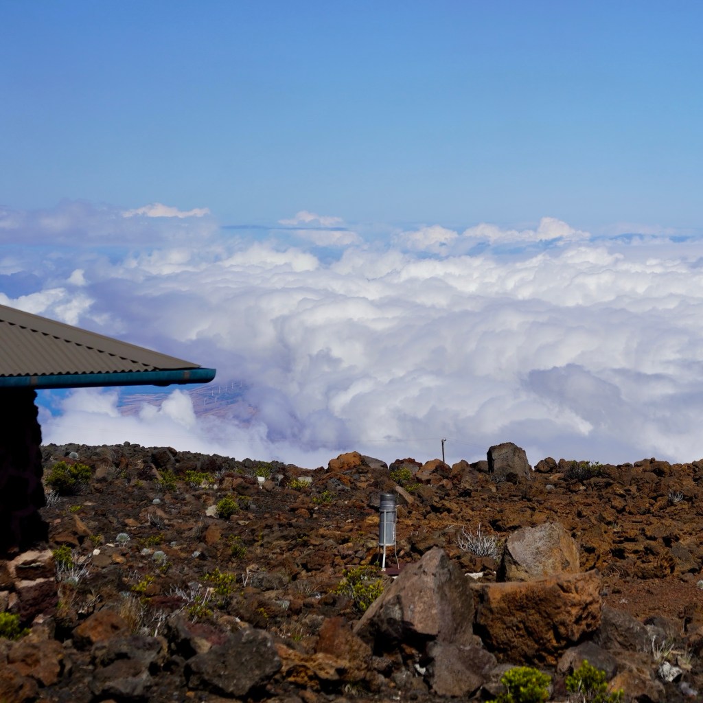 On the opposite end, the top of Haleakala sports the usually red cinder volcanic rock surrounded by a mixture of white clouds and blue sky.