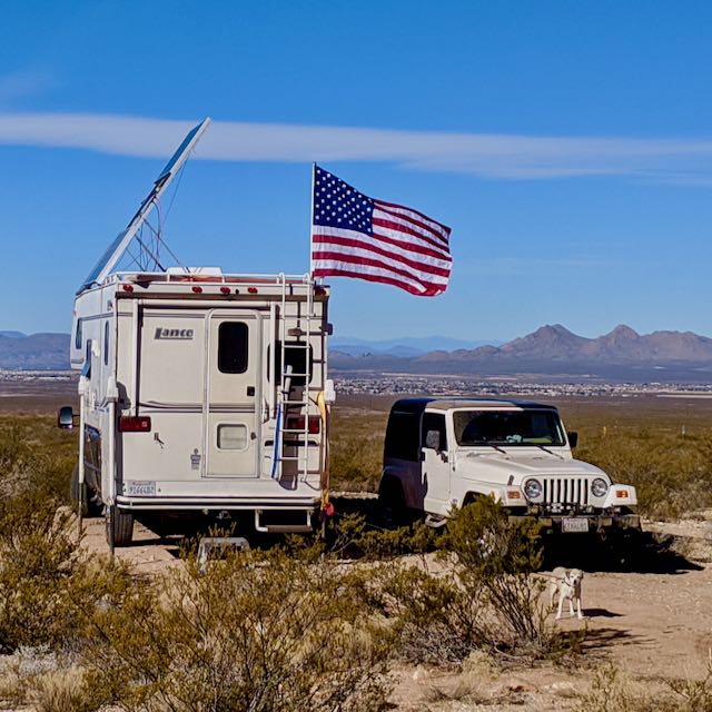 From a BLM location above Las Cruces, New Mexico, this attention getting flag wave was part of our earlier Lance camper.